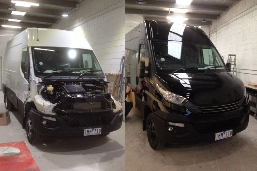 This Iveco van was supplied directly from the dealer for a colour re-spray. For this straight re-spray, from white to gloss black, the body was washed down with Prepsol to remove any silicon or waxes, and then the body was prepared for topcoat.